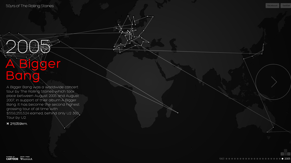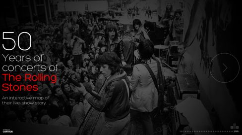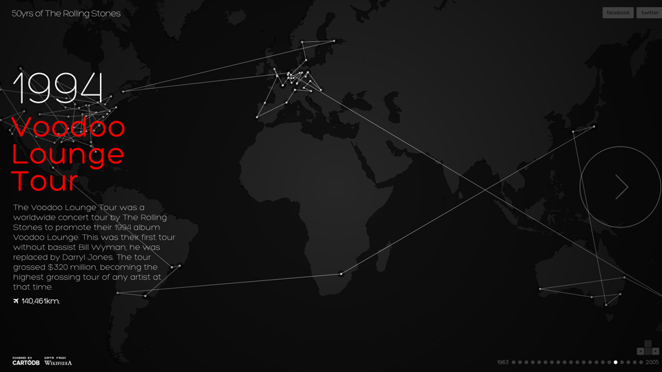 Já tem algum tempo que os Rolling Stones ultrapassaram o status de maior banda de rock em atividade para se tornar algo muito além. Apesar de todos os desentendimentos, dos escândalos, do sexo, das drogas, do ego… well, it’s only rock n’roll e por isso mesmo não se pode culpá-los. Há 50 anos na estrada, os Stones têm uma história digna de respeito, independentemente de se gostar ou não da banda, da música ou de seus integrantes. E foi para celebrar esta história que a CartoDB criou o infográfico interativo 50 Years of Concerts of The Rolling Stones, mapeando as turnês da banda entre 1963 e 2007.