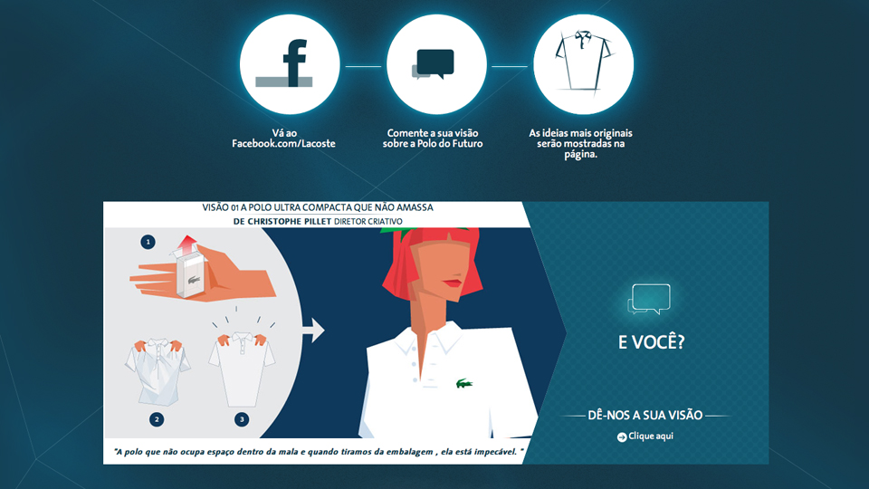 Quem quiser arriscar alguns palpites sobre como será a camisa polo do futuro, pode acessar o site Lacoste Future e compartilhar suas ideias. As mais “originais e singulares” serão divulgadas ganharão destaque tanto no site quanto no Facebook.