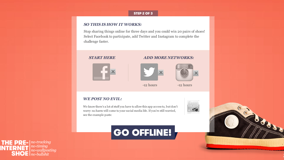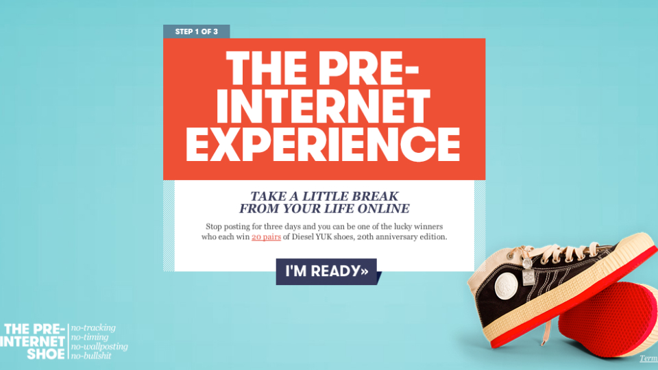 Diesel está relançando um antigo sucesso de 1993, o tênis YUK. Girando em torno dos “velhos e bons tempos” e promovendo um produto totalmente low-tech, a campanha Pre-Internet Experience, realizada pela agência SMFB, desafia as pessoas a não postarem nada no Facebook por 3 dias, ou no Twitter, Instagram e Facebook juntos por 2 dias. Serão 20 vencedores que irão receber o par de tênis.