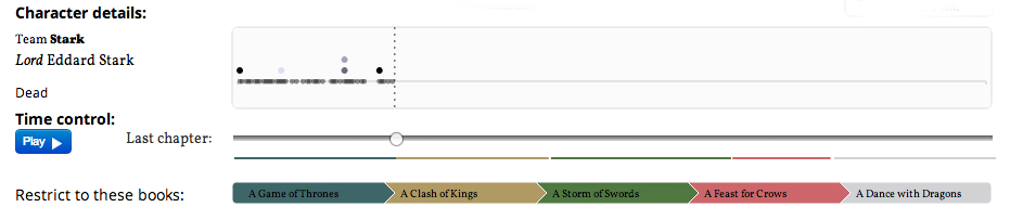 O infográfico é um grande círculo baseado nas relações construídas ao longo do tempo. Cada personagem representa um pequeno círculo cujo tamanho se refere à frequência de aparição na série. As famílias são agrupadas juntas. E, quanto mais perto estiverem da morte, mais escuro ficam seus círculos.