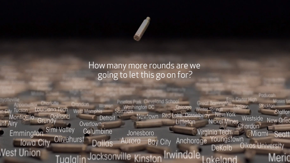 A campanha também conta com um comercial forte e ao mesmo tempo muito triste. A imagem mostra uma arma sendo disparada e cada bala com o nome de uma cidade onde ocorreram tragédias causadas por atiradores, como Columbine, Aurora e Newtown, para citar algumas. Enquanto isso, ouvimos a voz de pessoas falando a respeito, inclusive pais de vítimas.