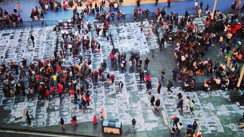 Nesta ação que propôs na Times Square, qualquer um pode fazer fila para tirar uma foto 3×4 e ainda levar um poster com seu retrato para colar no chão, que se transformou em um enorme mural de rostos.