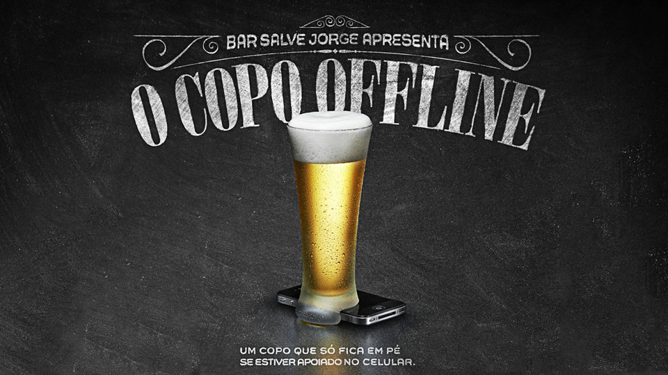 Nesse conceito do Bar Salve Jorge, em São Paulo, a única maneira de deixar o copo em pé na mesa é se ele estiver apoiado em um celular. O chamado Copo Offline pode até molhar o seu aparelho, mas pelo menos evita que você fique a noite inteira olhando para a tela.