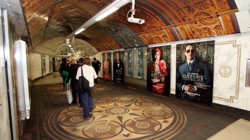 Os habituais cartazes, outdoors e placas presentes na estação foram substituídos por um enorme anúncio em campanha para o lançamento do filme. As artes gráficas cobriram todo o corredor principal da estação, do teto ao chão, dando a ilusão de que os passageiros estavam em um luxuoso salão de festa no estilo art deco, referência na época em que se passa a história.