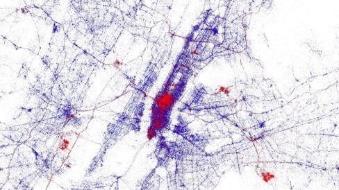 No Distrito Financeiro de Nova York, por exemplo, vemos que a maioria dos tweets vem de usuários locais, com exceção da área em volta do World Trade Center, Estátua da Liberdade e outras atrações turísticas.