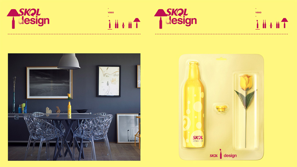 Pensando em transformar sua garrafa em objeto de decoração, a Skol vai lançar a coleção Skol Design. É um embalagem de alumínio que pode ser transformada em luminária, relógio, galheteiro, castiçal ou vaso após o consumo da cerveja.