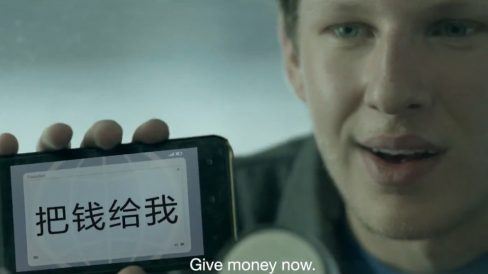 A ação se passa na China, quando um jovem francês tenta se comunicar com a atendente de uma casa de câmbio. O pedido dele é simples: “me dê o dinheiro agora”. Primeiro, pede em francês, depois, em inglês. Sem sucesso, tenta a mímica e, por último, faz o que qualquer pessoa com a tecnologia de um tradutor no bolso faria: escreve a frase no celular e mostra para o outro ler.