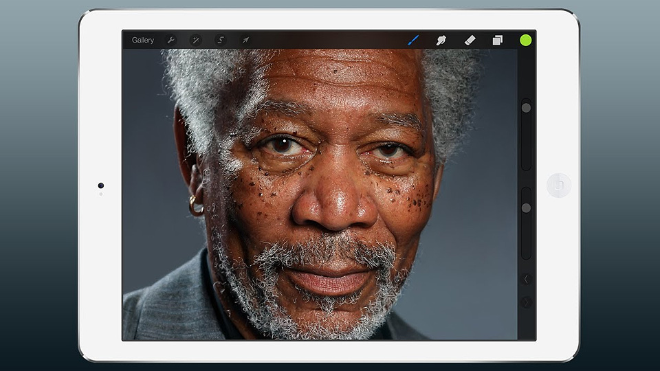 É um desenho do Morgan Freeman inteiramente feito no iPad, com impressionante qualidade fotográfica. O aplicativo utilizado por Lambert foi o ProCreate