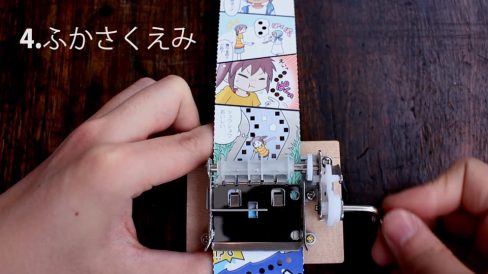 Dispositivo mecânico Otowa ativa trilha sonora da história usando tiras de papel perfurado