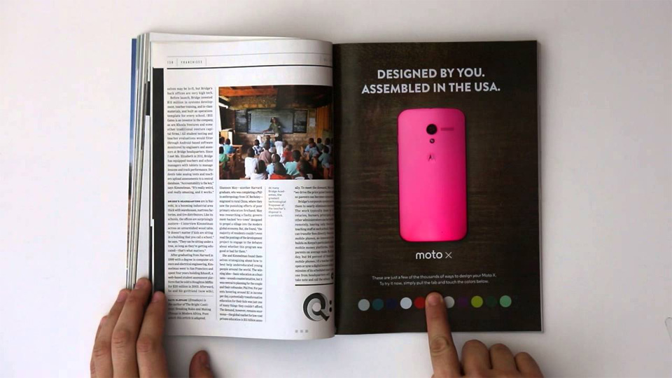 Apertando botões em um anúncio interativo impresso, os leitores da Wired de janeiro poderão trocar as cores do smartphone Moto X. A peça da Motorola será veiculada em 150 mil edições da revista, distribuídas apenas em Nova York e Chicago.