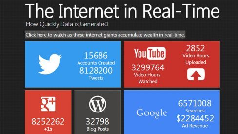 O site ‘The Internet in Real-Time’ é uma ferramenta que ajuda a entender melhor a dimensão disso tudo. A cada segundo gasto na página, os dados de tuítes enviados, vídeos assistidos, posts de blogs, receita do Google com anúncios, itens comprados na Amazon, check-ins do Foursquare, resenhas do Yelp, e toda uma sorte de coisas que podemos ‘deixar’ na internet são atualizadas, mostrando a enorme velocidade com que geramos dados para a rede.