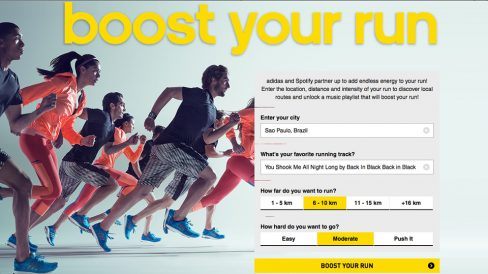 Se você gosta de correr, mas às vezes tem dificuldades para combinar a música certa com a rota escolhida, a Adidas e o Spotify podem te dar uma ajudinha no site Boost Your Run. Com uma mecânica facílima, é só digitar o nome da cidade onde você vai correr, qual a música que mais te inspira para praticar exercícios, a quilometragem que você deseja e o ritmo – leve, moderado ou pesado.