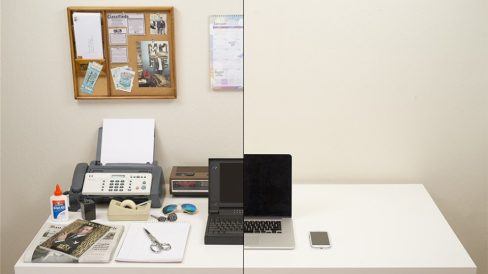 O Harvard Innovation Lab mostra que estamos basicamente insatisfeitos à toa. Eles emularam como seria uma mesa de trabalho dos anos 80 e mostram as principais mudanças dos últimos 30 anos: ao invés de computadores enormes, um fininho notebook; agendas telefônicas, mapas, livros e anotações se transformaram em aplicativos, todos dentro de um pequeno dispositivo que também faz ligações, substituindo os telefones com fio do passado.