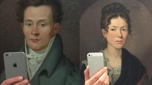 Pinturas retratistas ganham um toque contemporâneo com a adição de uma mão e um iPhone