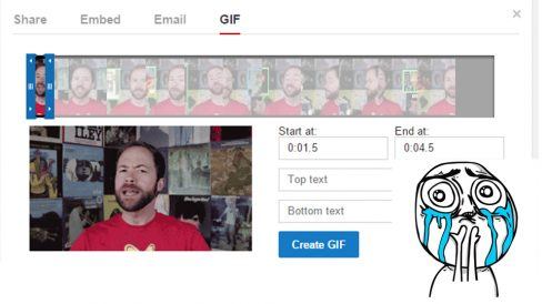 Adicionada à aba “share” do YouTube de alguns poucos vídeos – o que dá a dica do caráter experimental da ferramenta – já é possível transformar trechinhos de vídeo em GIFs animados com incrível facilidade. Basta selecionar o pedacinho do vídeo, que pode ter no máximo 5 segundos, escolher um texto para adicionar no topo e/ou no rodapé do GIF e clicar em “criar GIF”. Pronto, meme perfeito para começar a ser compartilhado.