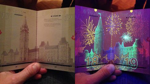 Passaporte canadense revela ilustrações coloridas quando exposto à luz UV