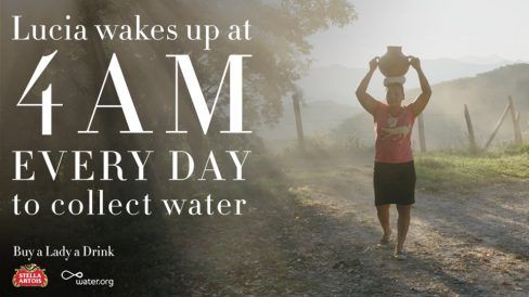 Em parceria com Matt Damon, responsável pela ONG Water.org, que quer levar água potável para os locais onde ela é mais necessária, a marca de cervejas Stella Artois criou a campanha “ofereça uma bebida a uma dama”.