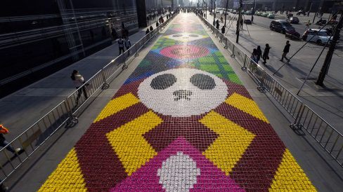 projetaram um tapete de doces de 185 metros de extensão. A construção na calçada levou 5 dias com a ajuda de 2 mil voluntários, que colocaram milhares de doces coloridos em caixinhas que formaram os “pixels” do desenho.
