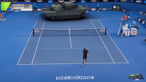 Djokovic jogando uma partida de tênis contra um tanque de guerra