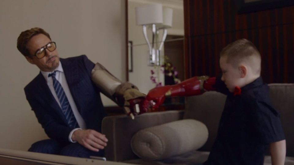 O ator encarnou Tony Stark para conhecer Alex, garoto de 7 anos de idade que tem o braço direito com má formação congênita. O dono da Stark Industries deu para ele um braço biônico igualzinho ao do Homem de ferro, desenvolvido pelo estudante Albert Manero. E inclusive chama atenção pelo resultado, produzido com uma impressora 3D, ser tão barato em comparação com o braço “dele”, que custou bilhões de dólares.