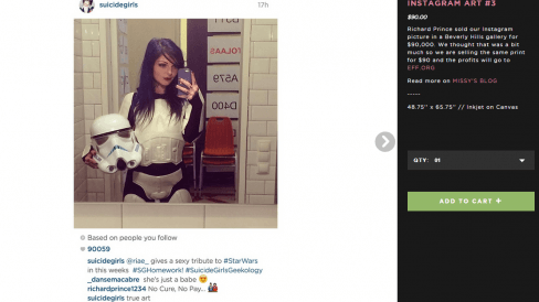 No entanto, ao invés de se rebelar e revoltar, a autora de um bom punhado das fotos usadas por Richard Prince em sua galeria resolveu capitalizar na situação. Selena Mooney, uma das fundadoras do grupo Suicide Girls, que teve algumas das suas fotos exibidas e comercializadas na galeria de Prince, decidiu vender versões ‘mais acessíveis’ das obras criadas pelo artista.