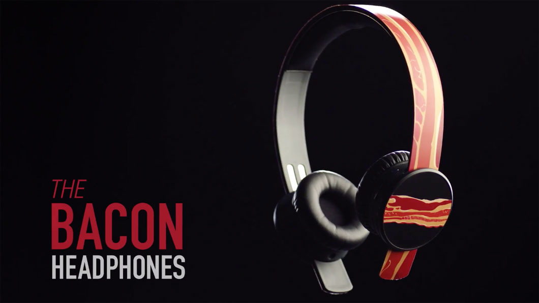 Para ilustrar essa ideia, vemos toda sorte de produtos inúteis, que vão desde um perfume com cheiro de bacon até um fone de ouvido feito de bacon.