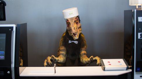 Você pode escolher entre uma assustadora recepcionista “humana” ou um simpático velociraptor para fazer seu check-in