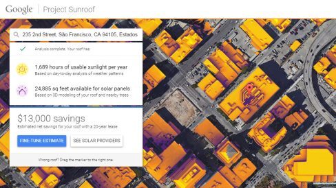 O Google estreou hoje um projeto que pode ajudar a diminuir o consumo de energia vinda de combustíveis fósseis. Usando o Google Maps, a empresa conseguiu mapear tetos de casas e prédios para poder estimar a quantidade de energia solar que eles podem captar. Estas informações foram disponibilizadas no chamado Project Sunroof.