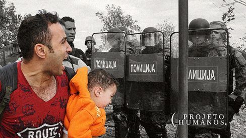 Descrição da foto na arte: refugiado sírio carrega uma criança enquanto tenta entrar na Macedônia pela fronteira com a Grécia, no dia 21 de Agosto de 2015.