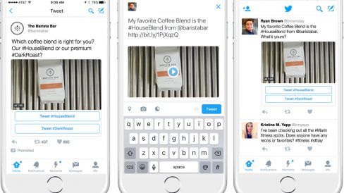 O Twitter começou a testar no final do mês passado um novo tipo de anúncio, que eles chamam de “Conversational”. No lugar de apenas promover um tweet, com esse novo formato a marca pode oferecer opções e provocar uma interação dos usuários. Apesar de já estar em testes, o anúncio foi oficialmente revelado apenas hoje num post do blog oficial do Twitter.
