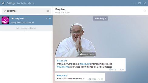 No canal @pgpompei, administrado pela iniciativa jovem da paróquia e ainda com a benção papal, publicará todo o dia durante a quaresma uma mensagem do Papa e outros membros do alto clero recitando um verso do evangelho. As mensagens são todas em italiano e o canal já conta com mais de 6 mil ouvintes. Eles têm até stickers do Papa, coisa que o WhatsApp ainda está longe de oferecer.