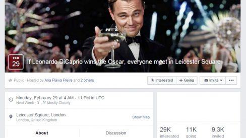 Leonardo DiCaprio poderá ganhar neste domingo seu primeiro Oscar, pela atuação no filme “O Regresso”. O fato de que ele nunca foi premiado depois de atuar tantos filmes já virou motivo até para um jogo, então dizer que o prêmio é esperado pode ser o eufemismo do ano. Mas pelo menos a internet está demonstrando seu apoio – na forma de eventos no Facebook.