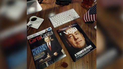 A quarta temporada de “House Of Cards” foi lançada hoje para streaming na Netflix. Para anunciar essa importante estreia no seu catálogo, a empresa pagou por um espaço de destaque em algumas revistas e jornais do país: a sua capa. Por isso Frank Underwood e seus parceiros Doug e Claire são destaque hoje nas revistas Carta Capital e Veja e também nos jornais Zero Hora e O Povo, dentre outros.
