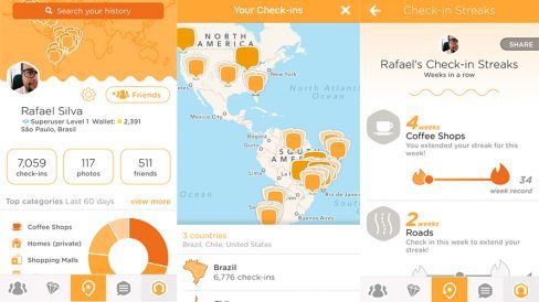 Também acessando o perfil pelo app é possível ver um mapa de todos os check-ins, que pode ser ampliado para mostrar detalhes. Agora também podemos ver um gráfico com categorias de lugares mais visitas, os amigos com quem mais são dados check-ins juntos, os lugares que mais visitamos e os ‘streaks’, que contam há quantas semanas consecutivas o usuário deu check-in em uma categoria.