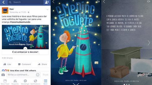 O livro, uma versão digital de “Menino e o Foguete” escrito por Marcelo Rubens paiva, foi ilustrado por Alexandre Rampazo e está disponível como post de destaque na página do Itaú no Facebook e para lê-lo é necessário acessar pelo celular. Abaixo você pode ver como ele é exibido no Facebook e no vídeo acima do post uma entrevista com Marcelo.