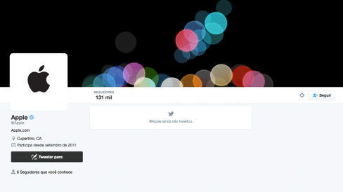 Nesta sexta, porém, a Apple finalmente colocou seu logo como avatar, subiu uma imagem de background que remete ao convite do seu próximo evento, e ganhou o selinho de conta verificada.