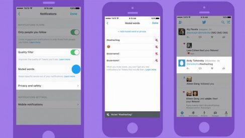 Há algumas semanas o Twitter deixou escapar que estava testando a opção de silenciar palavras, hashtags e usuários das notificações. Dessa forma seria possível esconder certos tweets, seja para coibir o abuso ou para evitar spoilers. Hoje a rede social oficialmente ativou essa opção.