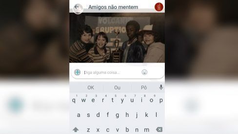 Os personagens Mike, Lucas, Dustin e Onze conversam em um chat sobre o desaparecimento de Will, utilizando vários recursos do aplicativo, como envio e edição de fotos, stickers, a assistente inteligente, e localização para marcar um ponto de encontro.