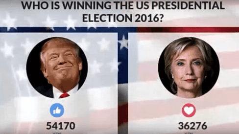 Uma tendência curiosa apareceu perto do fim das eleições americanas: páginas de veículos no Facebook começaram a fazer transmissões ao vivo com votações usando as reactions. Essa captura de tela acima é um dos exemplos, criado de forma improvisada com uma ferramenta que falaremos em breve aqui. Ao perceber que isso virou tendência o Facebook decidiu que não quer mais que isso aconteça.