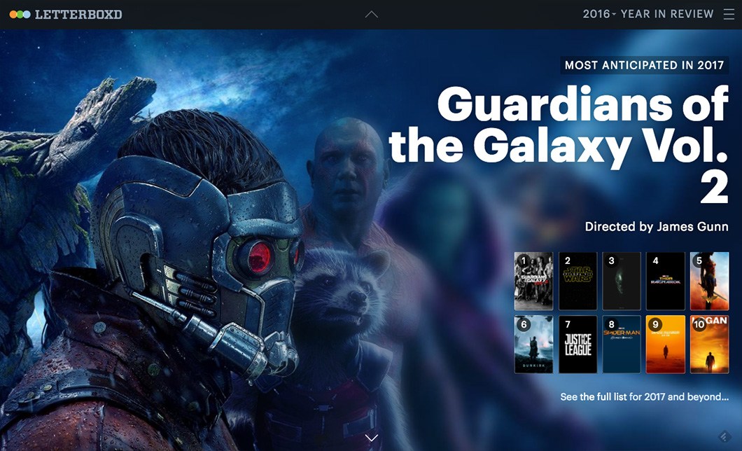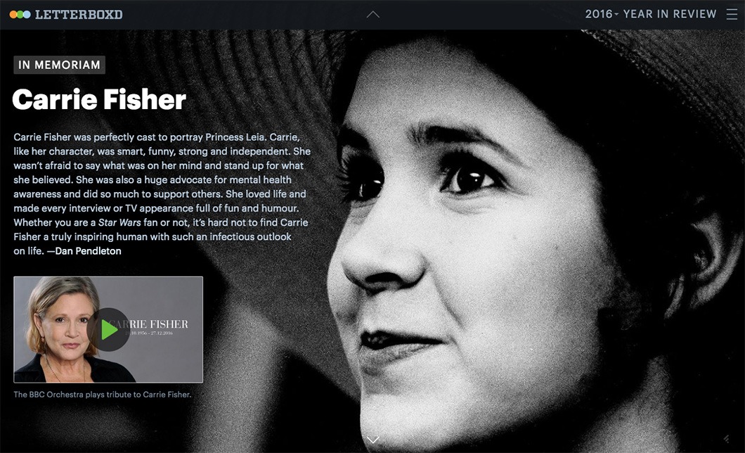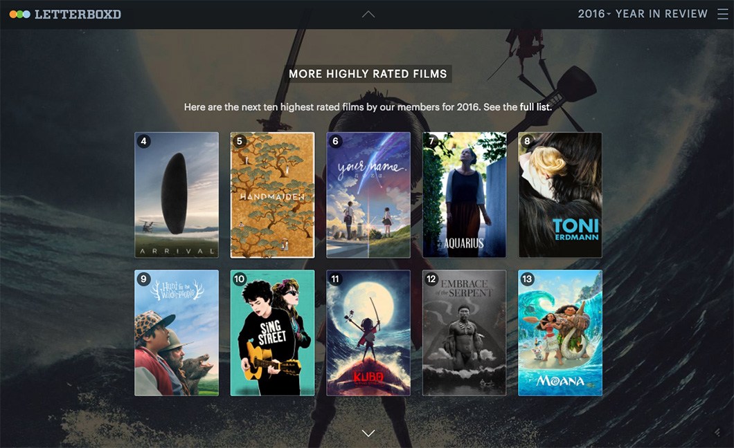 A retrospectiva ainda relembra os astros e estrelas que morreram em 2016, com belas homenagens em vídeo. Acesse letterboxd.com/2016 para conferir o ranking completo.