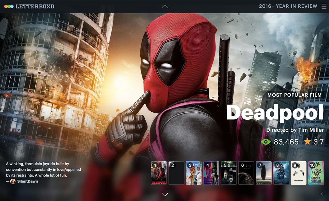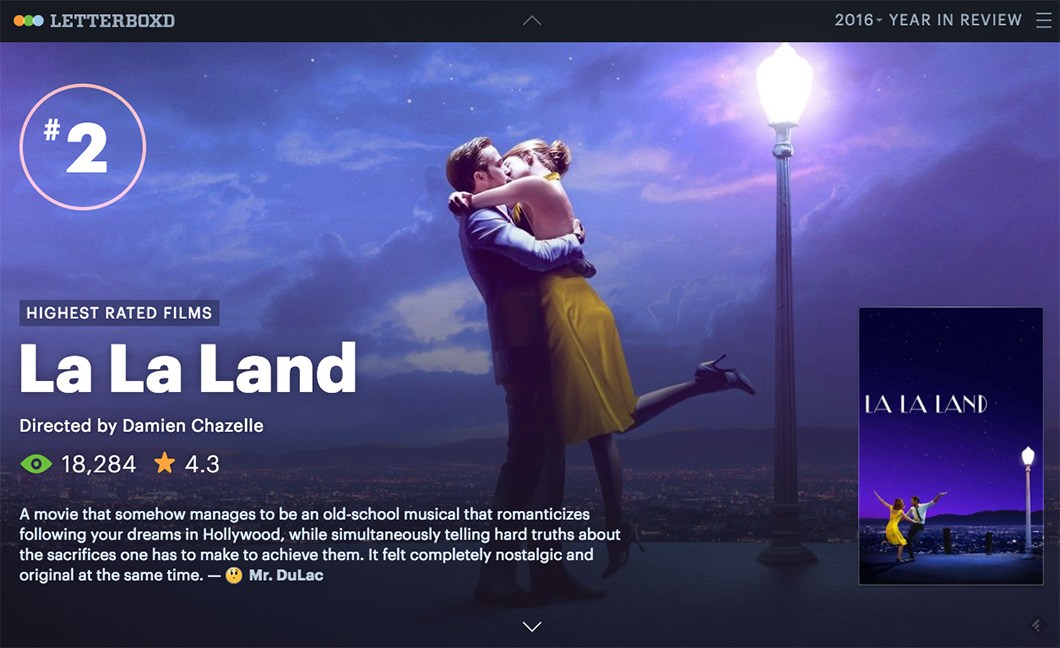 Letterboxd, a melhor rede social de cinema, revelou seu tradicional Year In Review. O ranking revela quais foram os filmes, atores, atrizes, e diretores mais populares em 2016 entre os usuários do site.