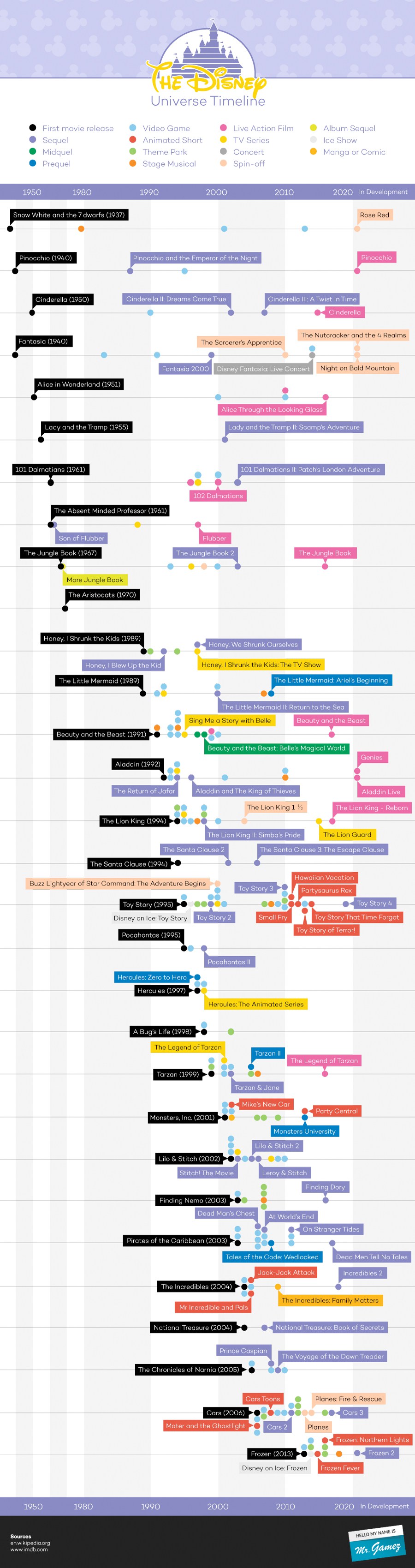 E é justamente essa história que o infográfico abaixo mostra, com a evolução da companhia, desde o seu começo em 1937 com Branca de Neve e os Sete Anões e vindo até os dias de hoje com a produção de Frozen 2.