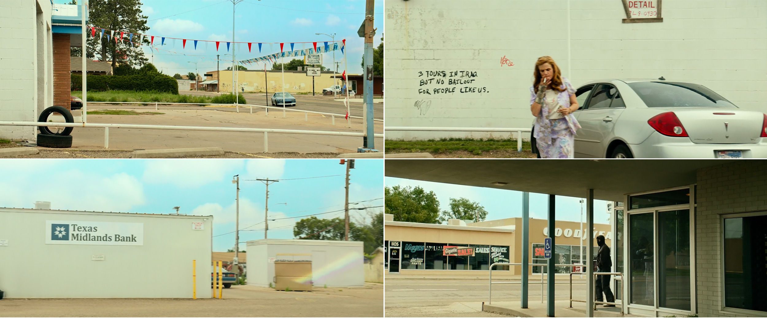 A frequência com que Toby e Tanner são retratados um à sombra do outro, como nas duas imagens acima, é enorme. Os dois estão quase sempre juntos em cena e, nos raros momentos em que se separam, o intuito parece ser sempre destacar o abismo entre suas intenções. É o caso, por exemplo, da longa montagem paralela no meio do filme: um conversa com a garçonete, o outro rouba um banco. Reunidos, eles combinam segurança e instabilidade e, partindo do Texas para Oklahoma, mergulham de vez nesse embate. No caminho, o texto coloca os personagens em contato com aspectos muito próprios da cultura local, em suas manifestações tradicionais ou típicas do século 21.