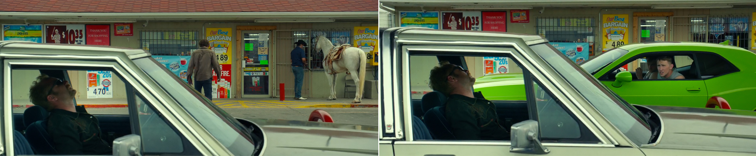 Uma queimada, por exemplo, espalha uma boiada no meio da pista. Por um instante, os detetives param o carro, e a conversa com os caubóis acaba oferecendo uma perspectiva desoladora sobre a vida na função nos dias de hoje. Já uma pausa no posto de gasolina leva Toby e Tanner a interagir com dois rapazes intolerantes em um carro verde-limão. Inserções gritantes de itens modernos ocorrem em algumas outras ocasiões. No caso em questão, como vemos nas imagens abaixo, o cavalo sai de tela e dá lugar ao automóvel, o rural se mistura ao urbano.