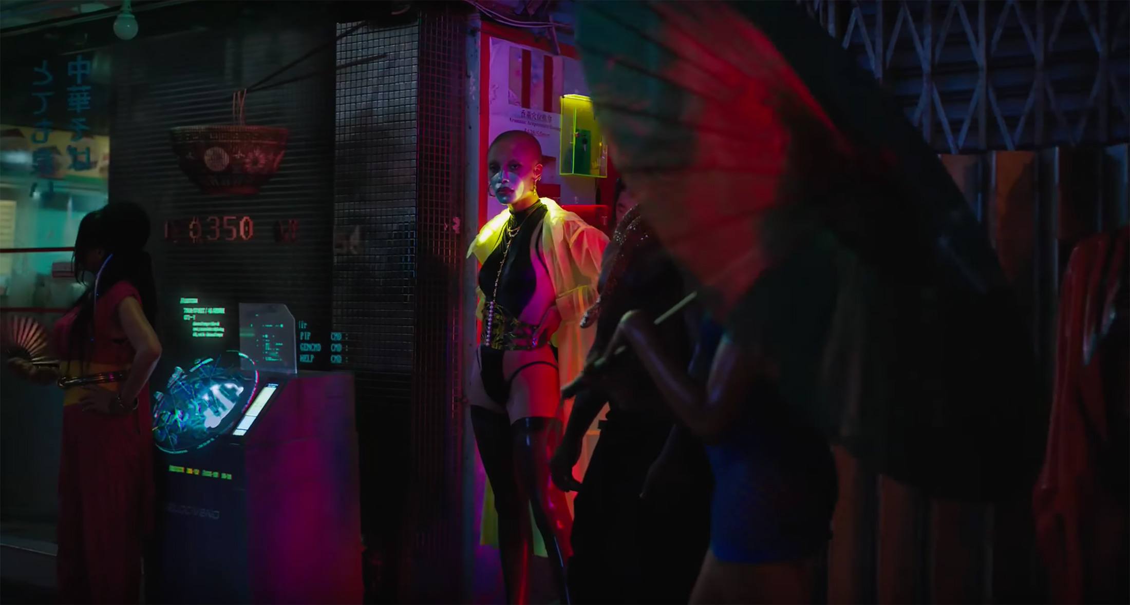 A cena em que a personagem principal conversa com Batou (Pilou Asbæk) no barco é um exemplo dessa mudança. Assuntos parecidos são discutidos aqui e no anime, mas o texto não busca a mesma profundidade nem o estilo contemplativo do original. Outro momento em que o filme abranda suas propostas em relação ao material de base é aquele em que a heroína encontra uma mulher (imagem abaixo) e decide conhecê-la, como se traduzisse a sequência da animação em que troca olhares com manequins em vitrines de lojas. A solução é interessante, mas revela uma criatura que não se enxerga com tanta clareza em outros seres fabricados e, assim como o filme, procura acima de tudo o contato com seu lado humano, de identificação mais fácil.