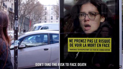 Anúncio assusta e fotografa pedestres atravessando a rua na hora errada