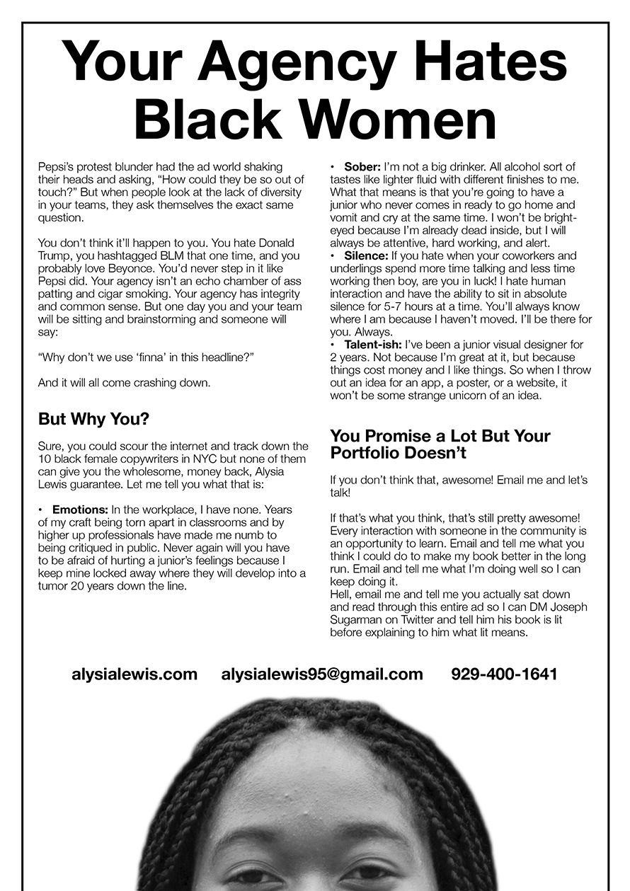 Nesta semana, uma cover letter chacoalhou o mundo publicitário americano. Negra e recém-formada, a publicitária Alysia Lewis publicou um anúncio de si mesma em um grupo do Facebook para pessoas à procura de emprego em Nova York. Intitulado “Sua agência odeia mulheres negras”, a publicação parte da desastrosa campanha da Pepsi com Kendall Jenner (no comercial em que, depois de uma manifestação, a socialite oferece uma lata a um dos policiais e tudo fica bem) para criticar a forma como a indústria publicitária trabalha com a questão da diversidade.