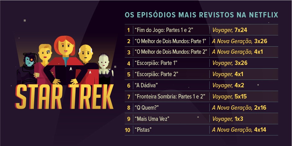 Ao analisar seus 104 milhões de assinantes em 190 países, a empresa descobriu que 12 mil fãs passaram cerca de 536 horas (ou 22 dias) assistindo a Star Trek. Os dados também revelas os episódios mais revisitados (confira o gráfico abaixo). “Fim do jogo: Partes 1 e 2” (temporada 7, episódio 24) é o episódio mais revisto de todas as séries da franquia. Capítulos que que introduzem capitães, espécies e personagens famosos também fazem parte da lista.