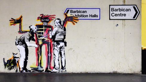 Londres voltou a receber o trabalho de Banksy. Em Barbican, dois muros foram o cenário da crítica do artista para a forma como as instituições fechadas tratam a arte de rua. As obras foram feitas nos muros do Barbican Centre, centro de artes e espetáculos londrino, que iniciará uma exposição do artista americano Jean-Michel Basquiat, conhecido por seus trabalhos neo-expressionistas pelas ruas.