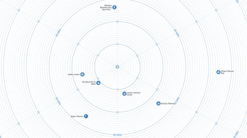 Em outras palavras, enquanto no Google Maps você já conhece qual seria o seu o ponto A e o seu ponto B, no mapa do tempo de Liu o destino ainda não é conhecido, apenas a atividade desejada (tomar um café ou almoçar), e as coordenadas vão levam para o caminho que faz mais sentido dentro de determinado intervalo de tempo, independentemente da região em que se encontra. Ou seja, também é diferente de um serviço de buscas que poderia priorizar locais na mesma região, mas que às vezes não é tão próximo a pé quanto outros que ficam nas redondezas por não fazerem parte do mesmo distrito ou bairro em que a pessoa se encontra.
